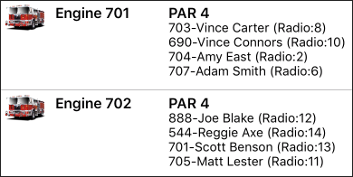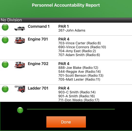 ZoneCommand Pro is always ready for an accurate personnel accountability report. Simply tap the PAR tool and all units on scene, crew assignments, and radio numbers (if any) appear.