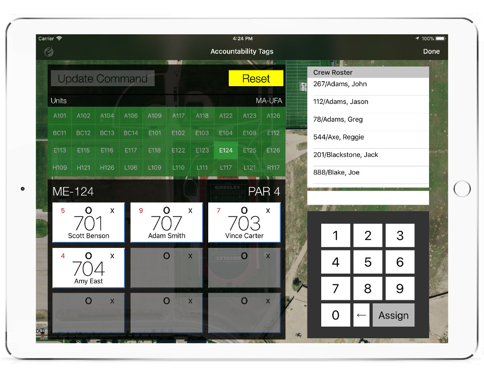 ZoneCommand Pro features an optional screen for digital accountability tags. When volunteers arrive, they'll go to the available unit on scene and punch in their Crew Id and radio number using our exclusive digital accountability tag screen. Unit crew assignments forward to the incident commander's dashboard automatically so that when the battalion chief arrives they simply start ZoneCommand Pro and crew assignments for all units on scene are immediately available to them.
