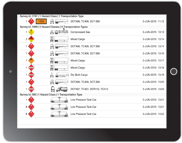 Tap to select a rail or roadway transportation type. Tap to select a hazard class placard. Tap to timestamp and save. It's that easy. Eliminate time-consuming forms and improve accuracy. What's more, there's no re-keying information into a spreadsheet or database after the survey. When the survey is complete, just a few more taps to submit the survey to a secure database in the cloud and the data is available for hazard studies.