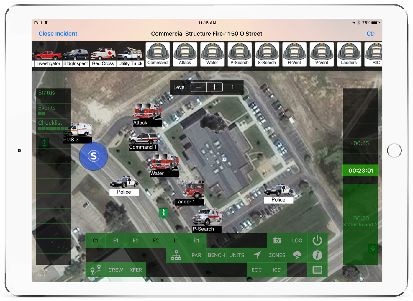 Finally, every incident detail at your fingertips. Just drag, tap, and swipe. Drag a dispatched unit to scene. Drag a crew assignment to the unit on scene. Tap a hydrant to reveal its GPM flow rate. Tap to run an accountability report (PAR). Tap to record a search benchmark, and more...It's that easy to use and it's designed for all levels of command experience.
